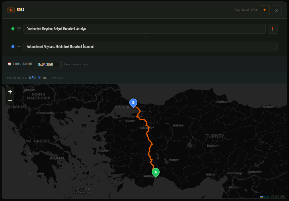 Yolculuğunuzun başlangıç ve varış noktalarını girerek rota oluşturma işlemini başlatabilirsiniz.